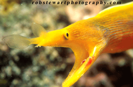 A female ribbon eel, near mating is all yellow, changing to blue after mating. This one houses a small crustacean on her jaw.